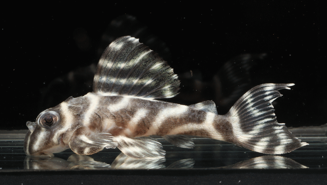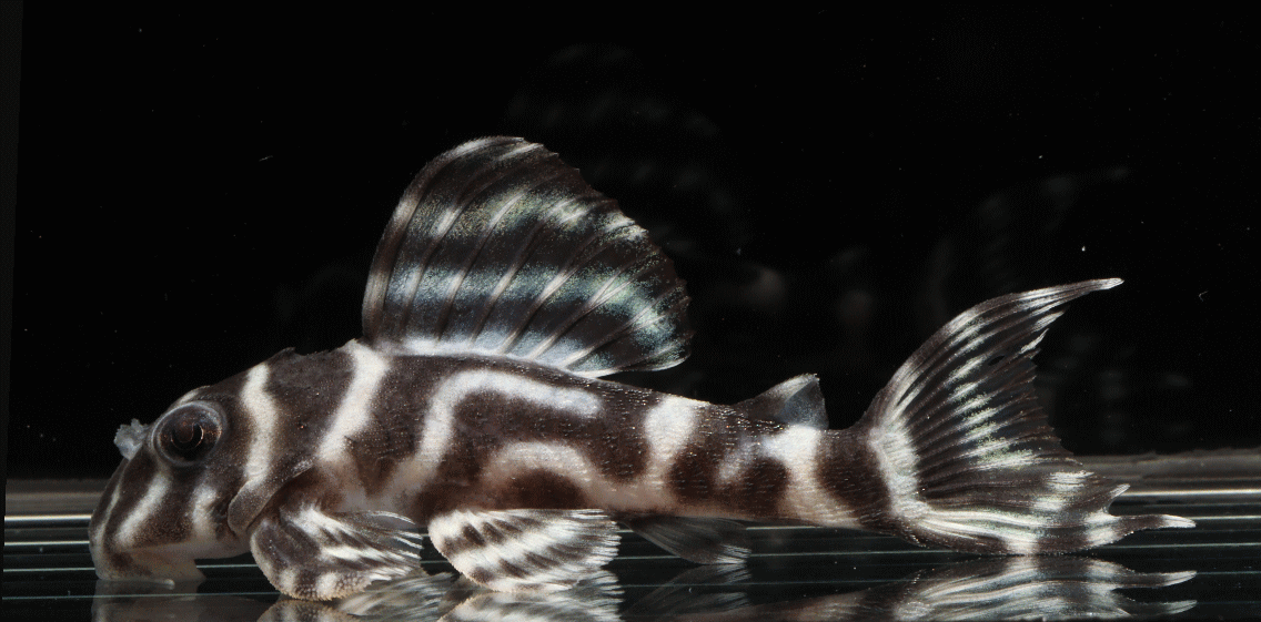 ① シルバーシャドーゼブラ finプシケの孫  第2セット No1 4.8cm ¥148000 プシケのF2では ロイヤルゼブラ表現の子供が多く見られるため、反転すれば青白い白質のシャドータイプのネガティブが多い ↓
