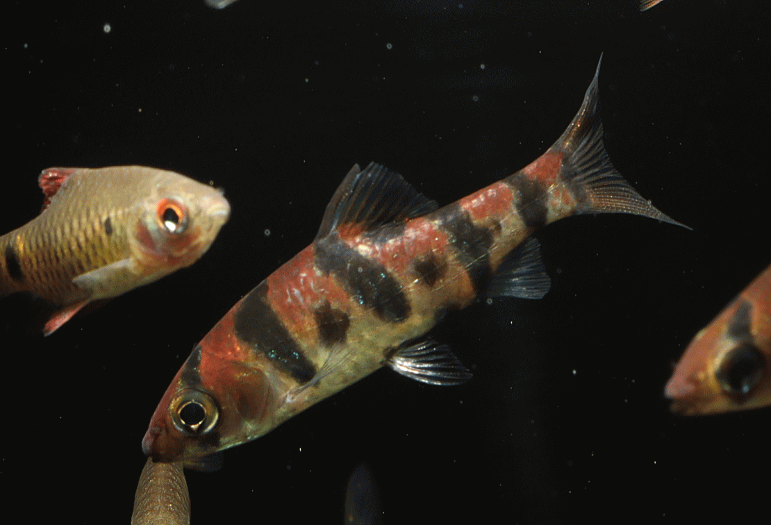 ④ デスモプンティウス エンデカナリス 4~4.5cm程 4匹で¥3300 Desmopuntius endecanalis です。デスモプンティウスの仲間は、ひし形体型が多いですがこちらはスレンダー・・・と入荷当初のブログに書いたのですが、ひとまわり成長したらこのとおり! 体こうがでて素晴らしいバルブとなりましたw。残り1セット ↓