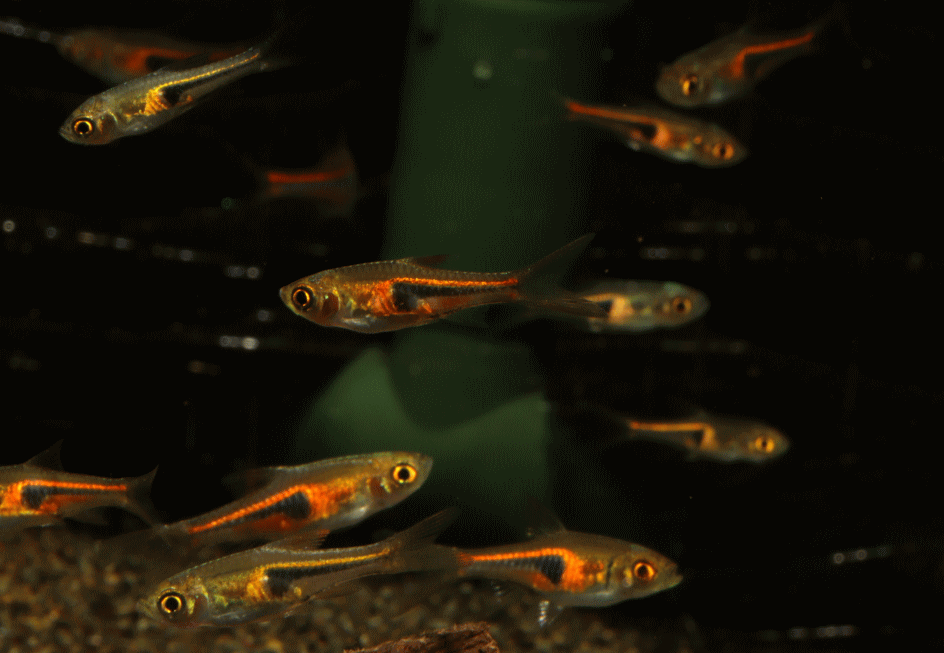 ⑤ ラスボラ エスペイ 2cm程 5匹¥1000 Trigonostigma espei 。ヘテロモルファよりは体こうが低くスレンダーで小型。オレンジカラーの質も明るく派手に見えます ↓